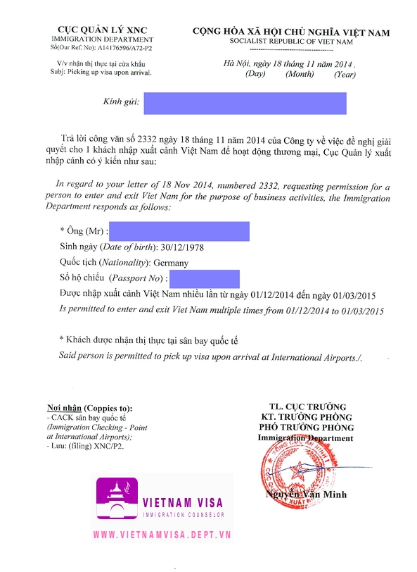 (Visa approval letter for German processed by Vietnam visa DEPT)